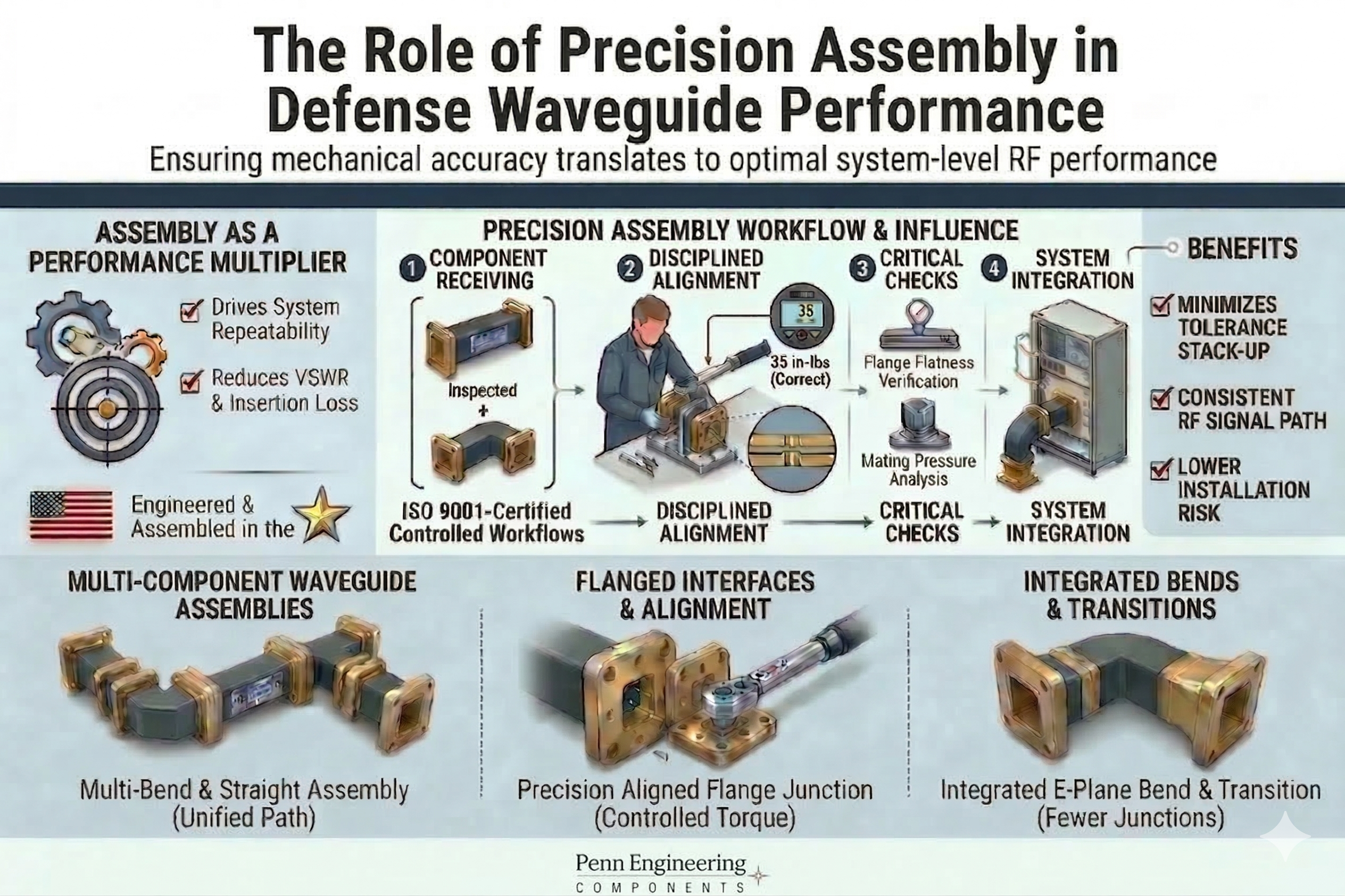 Penn Engineering Components manufactures precision compact waveguide assemblies, custom transitions, and tight-tolerance flanges engineered to meet the mechanical and dimensional demands of aerospace and defense avionics applications.